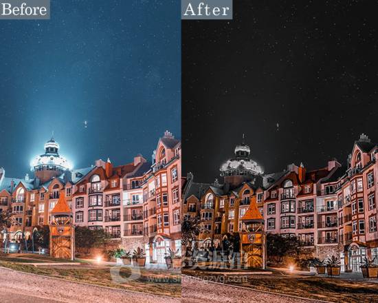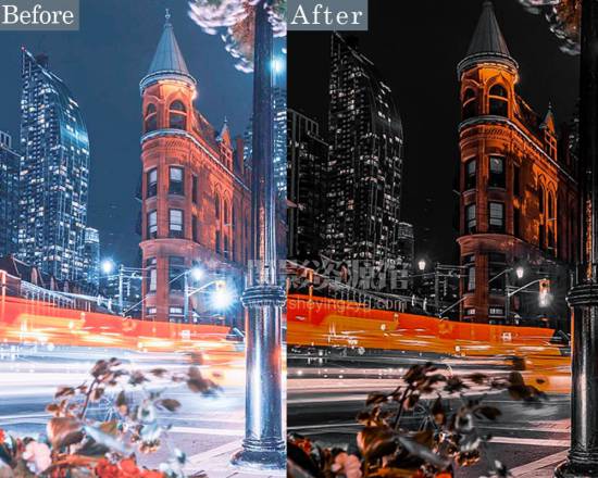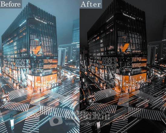 黑色和橙色的主色调可以突出夜景神秘感和温暖灯光的对比,通过增强阴影来凸显城市灯光,非常适用于都市夜景人像或风光摄影,能够使您的照片更加时尚专业。
