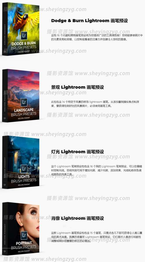 该捆绑包包括 4 个包和 60 多个 Lightroom 画笔预设,您将能够大幅提升您的编辑水平。