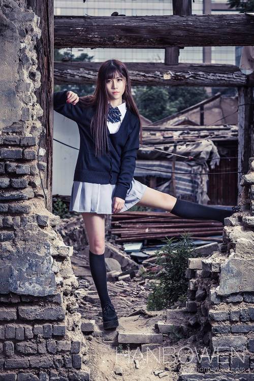 废墟内的制服少女