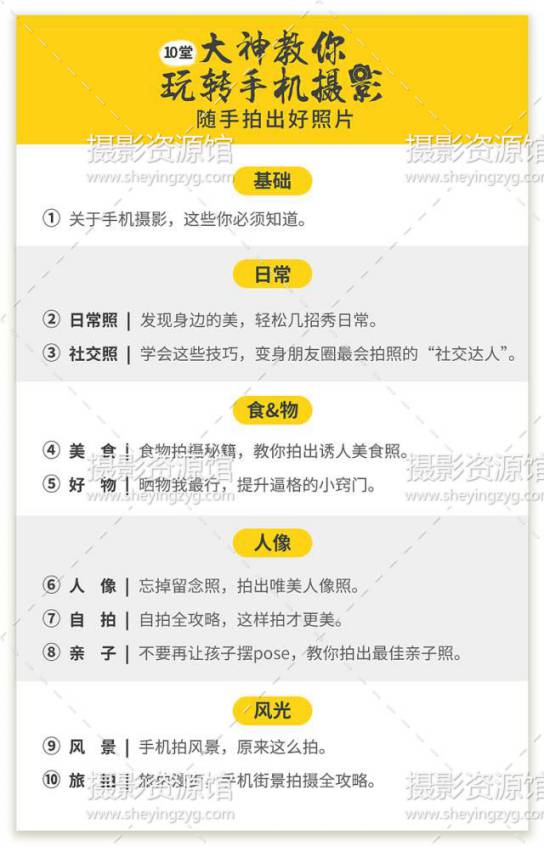 从日常到社交,从人像到风光,涵盖所有生活场景,给你最系统的手机摄影解决方案。