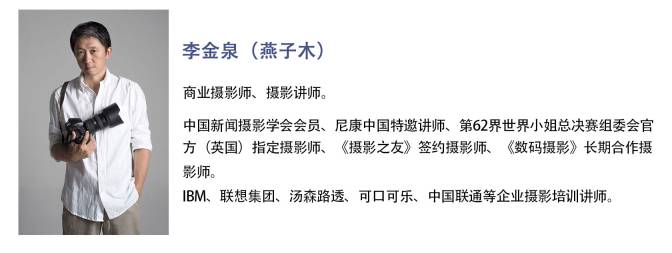 李金泉老师是商业摄影师,拥有丰富的拍摄经验,是IBM、联想集团、汤森路透、可口可乐、中国联通等企业摄影培训讲师。