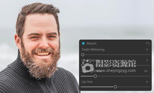 牙齿和嘴唇也会自动检测。您可以轻松调亮笑容并调整嘴唇的颜色和饱和度。