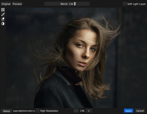 Retouch4me肖像卷会自动增强肖像的深度感。它使眼睛更加明亮,强调嘴唇,鼻子并画出椭圆形的脸。