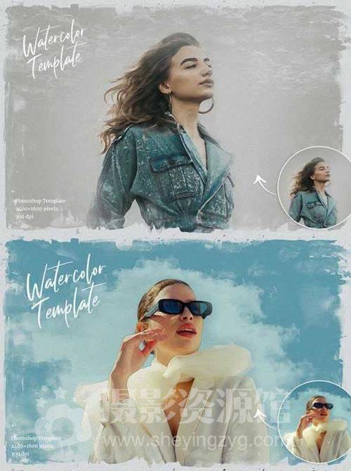 水彩画PSD模板|智能对象模板,照片转水彩画效果