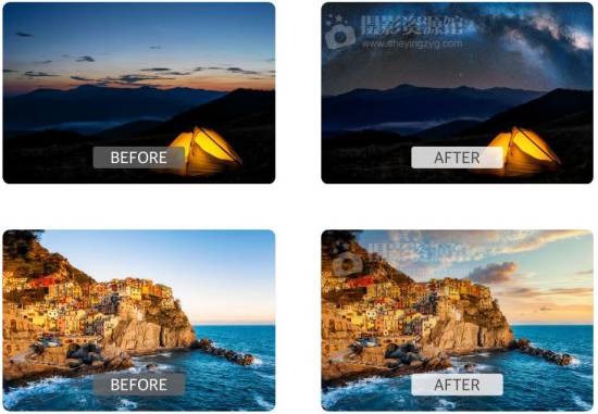 在长时间曝光的照片上使用这些天空,并轻松 为构图添加