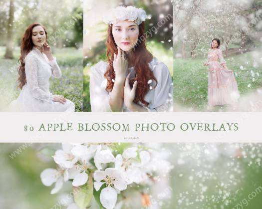 Apple Blossom 照片叠加。在几秒钟内创造一个梦幻、精致的春天外观,有许多不同的花边、飘落的花瓣和花朵。