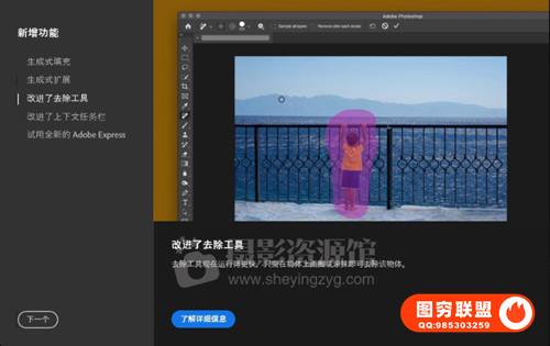 Photoshop 中的移除工具 ( ) 是一款简单易用、功能强大的工具,可快速、轻松地清理图像。使用“移除”工具可去除照片中的干扰元素或不需要的区域。移除工具使用智能技术,在用户轻刷不需要的对象时即可将其去除,并自动填充背景,同时保留对象的完整性以及复杂多样背景中的深度。