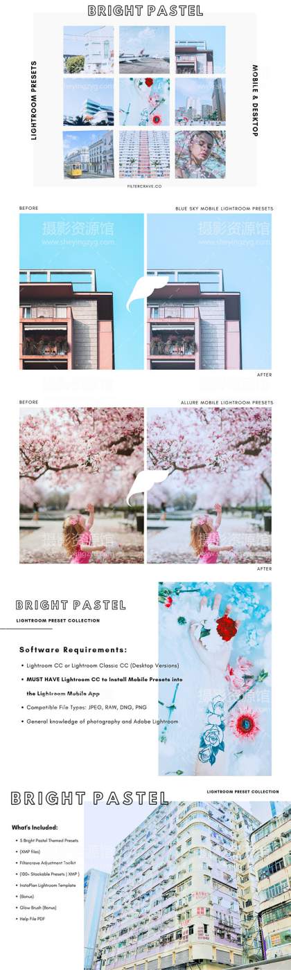 明亮的粉彩系列这个主题包括5个Lightroom糖果色预设,包括温暖和冷静明亮的柔和外观。 每个预设都有不同的外观供您选择和开发Instagram主题。 集合中的预设范围从细微变化到剧烈变化。